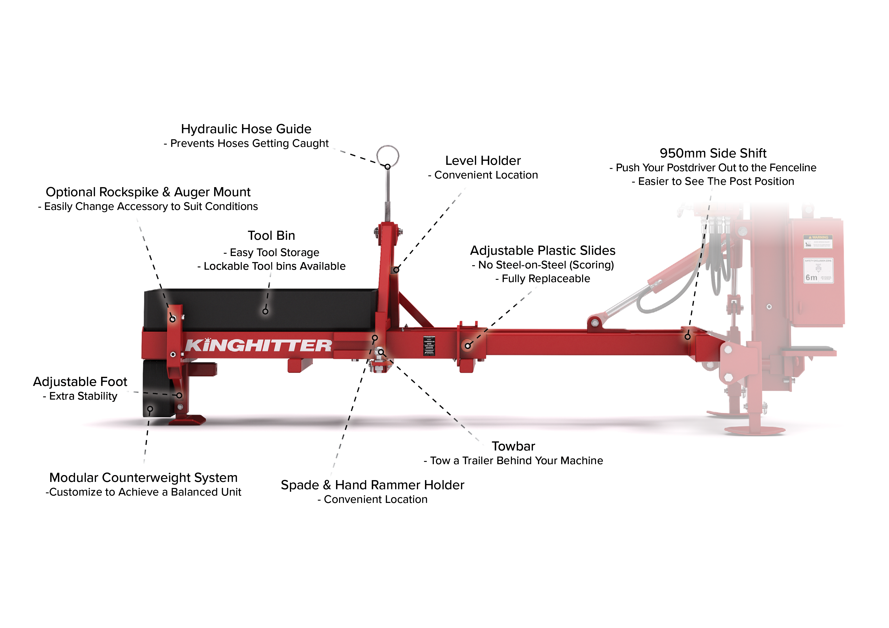 The Terminator Base mounts the post driver in a side-mounted position and provides a massive 950 mm of side shift. This lets the operator drive alongside the fence line and slide the post driver into line with a pull of the lever.